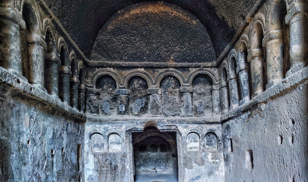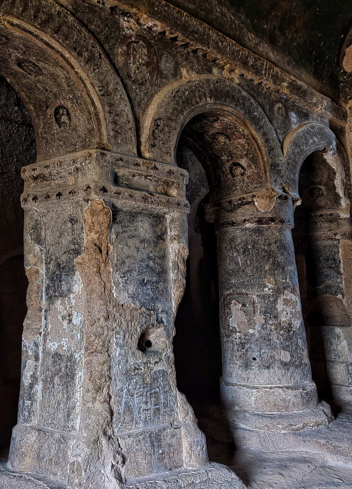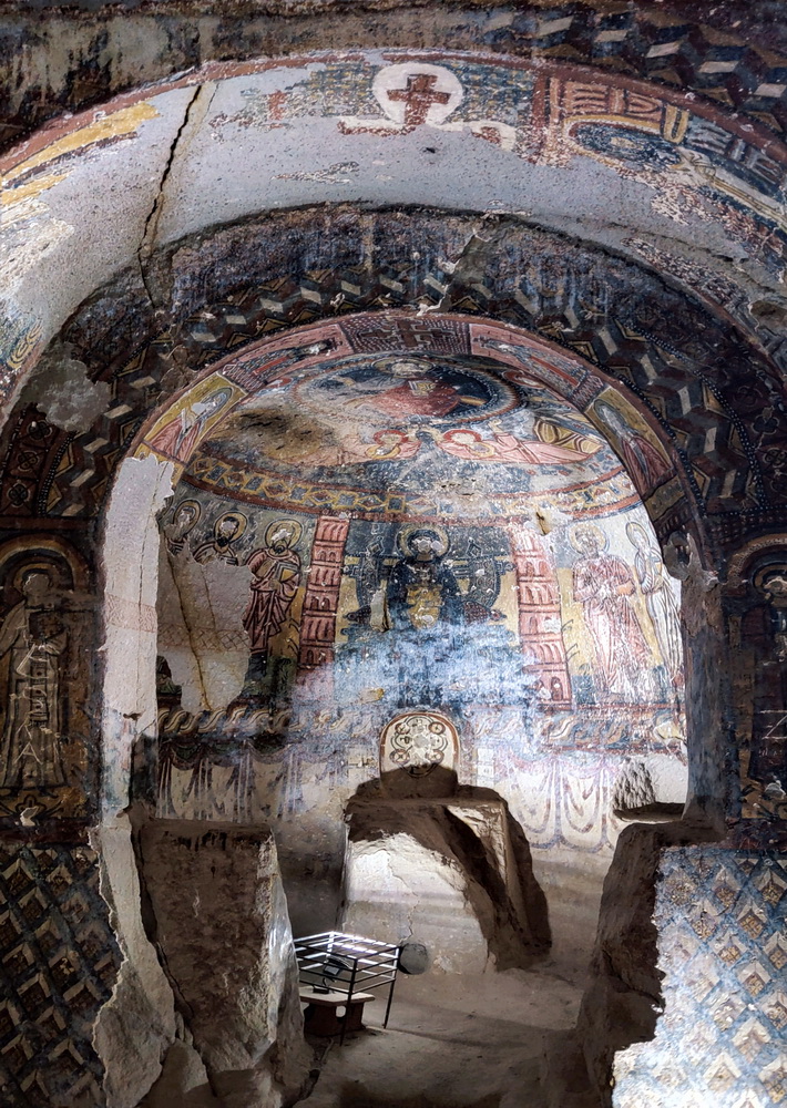 Стародавні ікони перших днів можна побачити чіткіше, але детальні фрески, намальовані пізніше, ледь помітні під роками сажі, що покриває поверхні, коли турки використовували кімнату для приготування їжі.