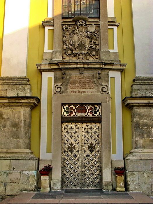 Головний вхід акцентовано високим арковим вікном з бароковим облямуванням, рельєфом з гербом та пам’ятним написом.
