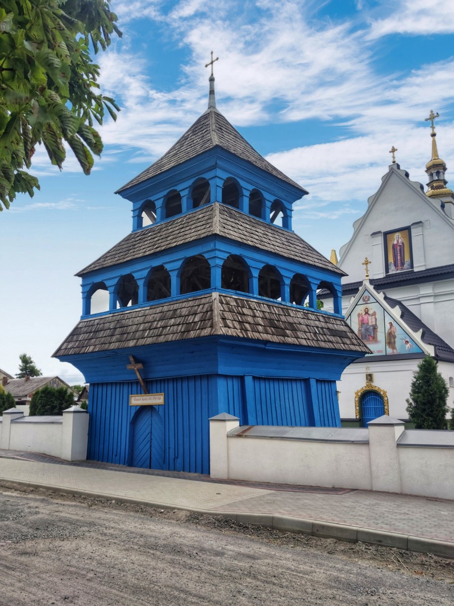 Церква св. Параскеви разом із дзвіницею напроти костелу навпаки виглядають природно і відреставровані із дотриманням усіх архітектурних канонів. Хоча і належать УПЦ (колишній московський патріархат). Бабуся-служительниця церкви зустріла нас з гостинністю і запросила на сьогоднішню молитву за українських воїнів.