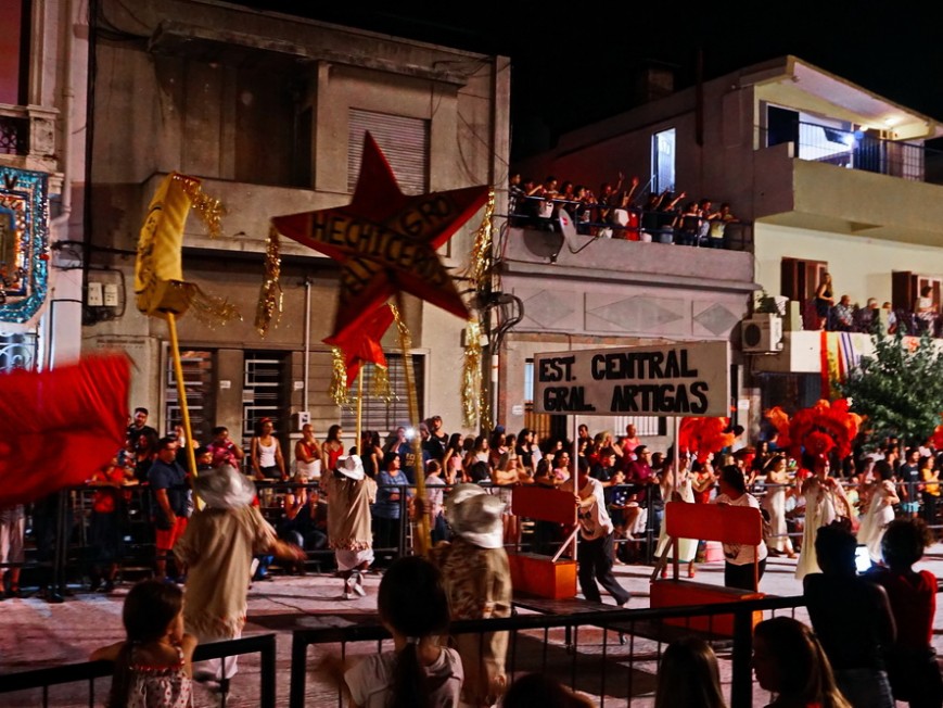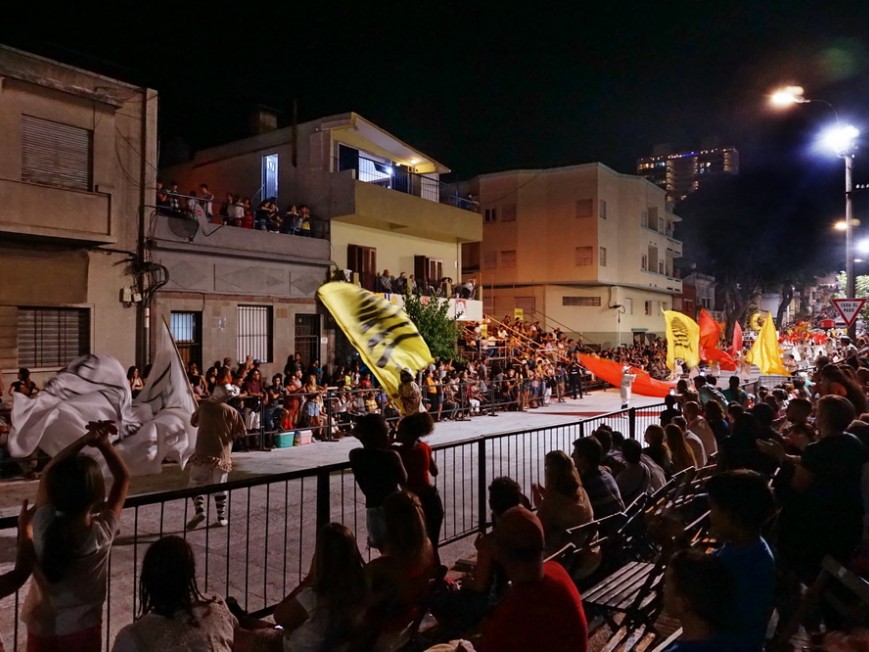 Карнавал в Монтевідео може тривати з лютого по березень. Ми потрапили на кульмінаційну його частину, яка називається LasLambadas. Вона проходить вулицею Ісла-де Флорес, яка йде паралельно набережній. Першими у ході йдуть танцювальні групи. Вони змагаються між собою. За ними - "маски" - костюмовані учасники. Потім - жонглери.А наприкінці з'являється "Прима карнавалу".