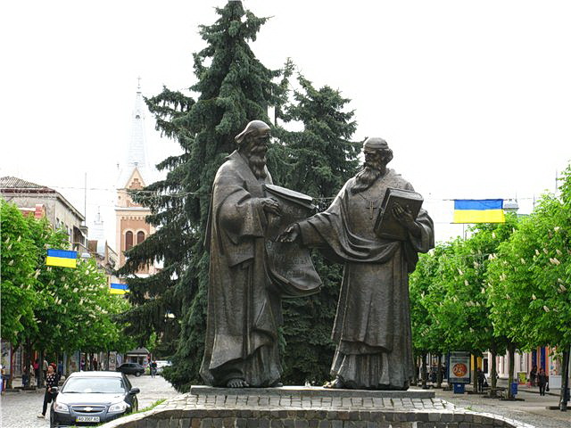 До 1100-ї річниці Мукачева скульптором О.Анляшоши споруджено пам’ятник Кирилу і Мефодію: