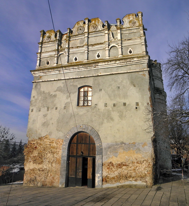 Вимурувана з пісковика на вапняному розчині, кладка армована дерев'яними зв'язками. В першому ярусі знаходився наскрізний арочний проїзд. Мала обхідні дерев'яні галереї.