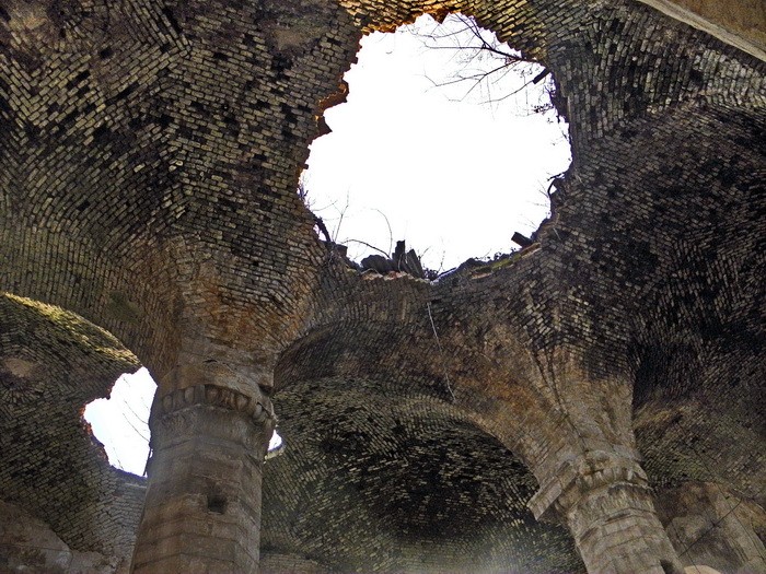 З чотирма внутрішніми восьмигранними стовпами з тесаного каменю, які поділяли її внутрішній простір на п’ять рівних частин. Стовпи були завершені та­кими ж восьмигранними композитивними капітеліями з квадратними карнизами зверху, на які опиралися циліндричні склепіння. Своїми ося­ми склепіння орієнтовані в напря­мі південь-північ. В протилежному напрямі стовпи зі стінками і між собою були з’єднані півкружними арками, які мали меншу висоту, ніж склепіння. Ширина арок і стовпів – 1,3 м. Чотирьом центральним стов­пам відповідали плоскі пілястри на стінках з аналогічними композитив­ними капітелями й абаками. Шири­на пілястрів така ж, як і стовпів. До другої світової війни капітелі піля­стрів були яскраво поліхромними, а стеля вкрита орнаментами рос­линного характеру.