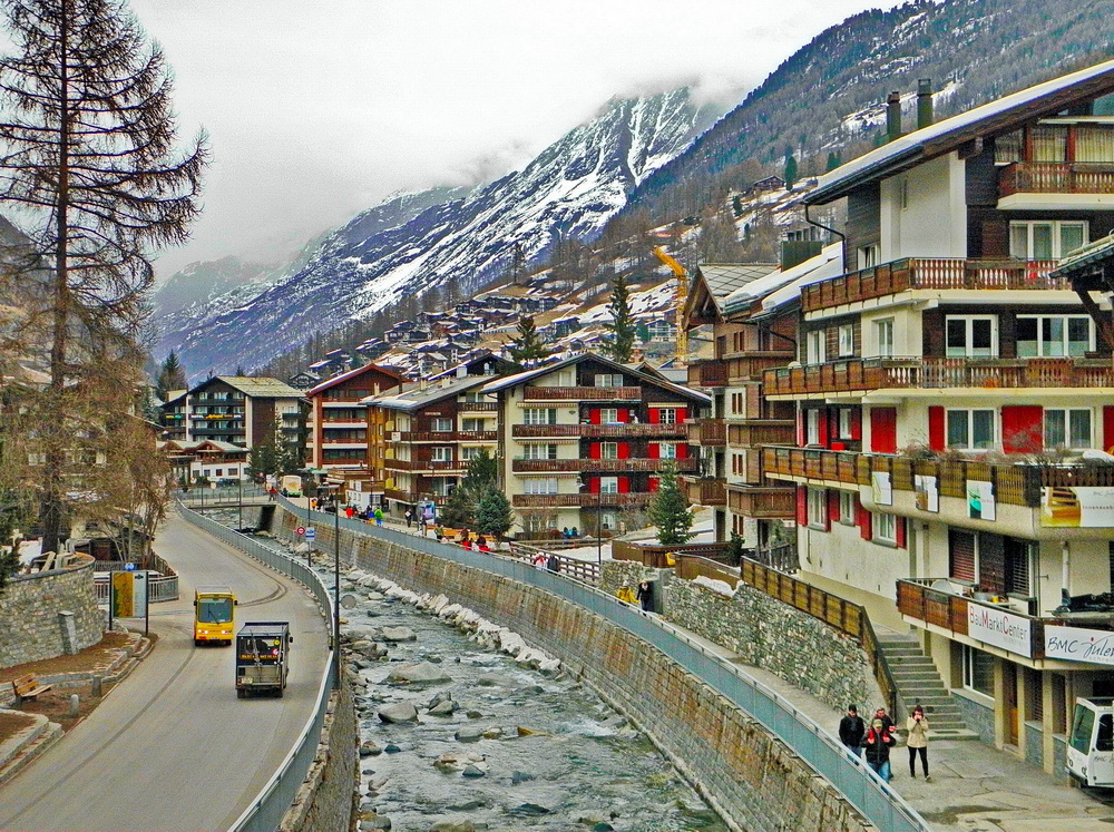 Перша пересадка - на станції Вісп. Гори тут вражають! Пересідаємо в інший поїзд, який круто піднімається догори у містечко Церматт - відомий швейцарський курорт. Він вважається екологічно чистим містом, серед транспорту тут - лише електромобілі. Церматт забудований типовими для гірської частини Швейцарії дерев'яними будинками.