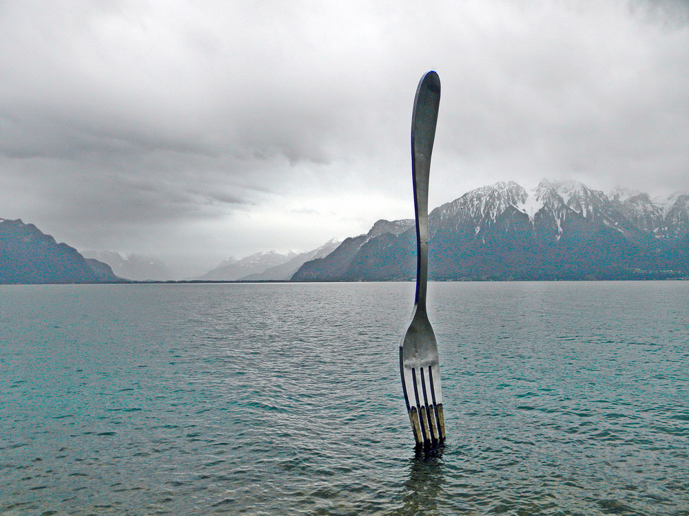 Наступна зупинка - Веве (Vevey) - курортне містечко на Швейцарській Рив'єрі. Центр виноградного регіону Лаво, база корпорації "Нестле", у ХІХ столітті - улюблене місце життя і відпочинку світової інтелігенції: письменників, художників, акторів. Сьогодні Веве - це невелике туристичне містечко з Ринковою площею, маленьким Старим містом, вічно квітучою набережною та чудовими видами на озеро Леман та Савойські Альпи. На набережній побачимо сучасний символ Веве - велетенську 8-метрову виделку з нержавіючої сталі, встромлену в озеро. Виделка була встановлена навпроти Музею їжі компанії "Нестле", автор проекту - швейцарський скульптор Жан-Пьєр Заугг.