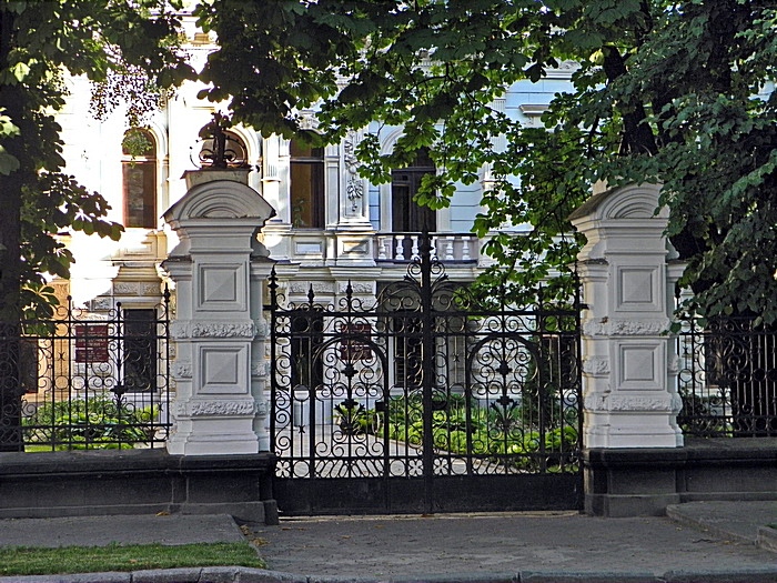 Будівлі доповнюють одне одного в архітектурному сенсі та об'єднані металічною огорожею з відштукатуреними цегляними стовпами.