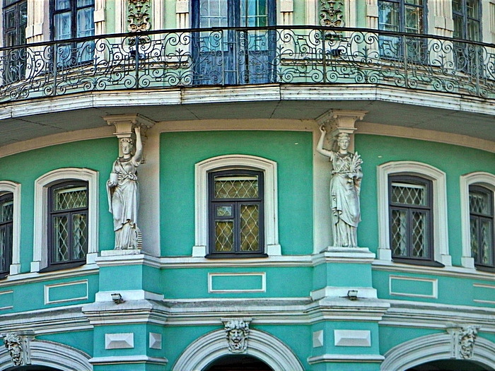 Перший поверх рустований під так звану «шубу». Другий зроблений за всіма канонами класичної архітектури: це й пілястри коринфського ордеру, і напівколони, і всіляка ліпнина декоративного характеру (гірлянди, рельєфні модульйони, віньєтки, картуші та рослинні орнаменти). Вікна будівлі мають у своєму оформленні сандрики та замки в арочних прорізях, у вигляді голови царя звірів-лева. Також над центральним входом виступає невеликий балкон (справа та зліва від нього міститься ще по дному балкону з балясинами).
