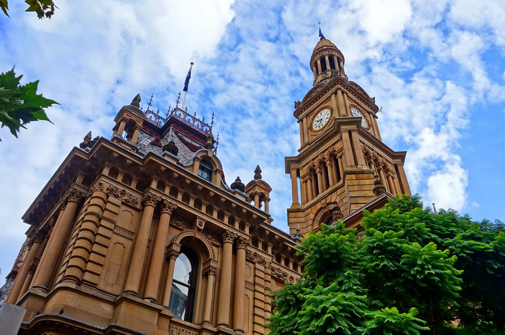 Будівля ратуші є щиро декорована елементами класицизму, а її прикрашає граційна висока вежа з годинником і ренесансний дах.Ратуша в СіднеїРатуша в Сіднеї