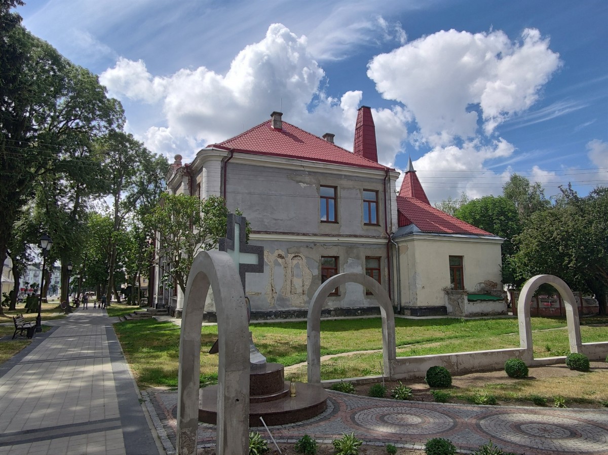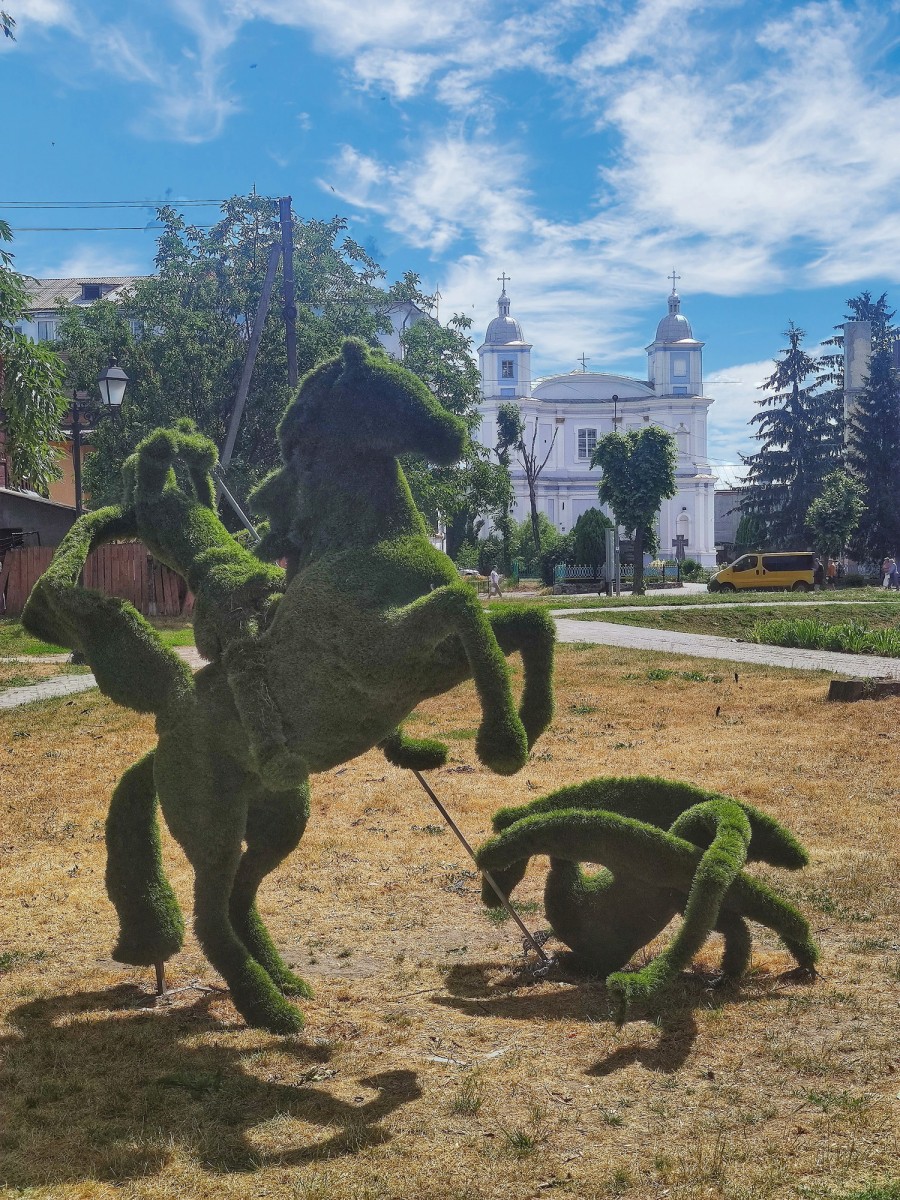 За костелом знаходиться міський сквер, де поруч з палацом урочистих подій споруджено дуже гарні зелені скульптури (топіарії):